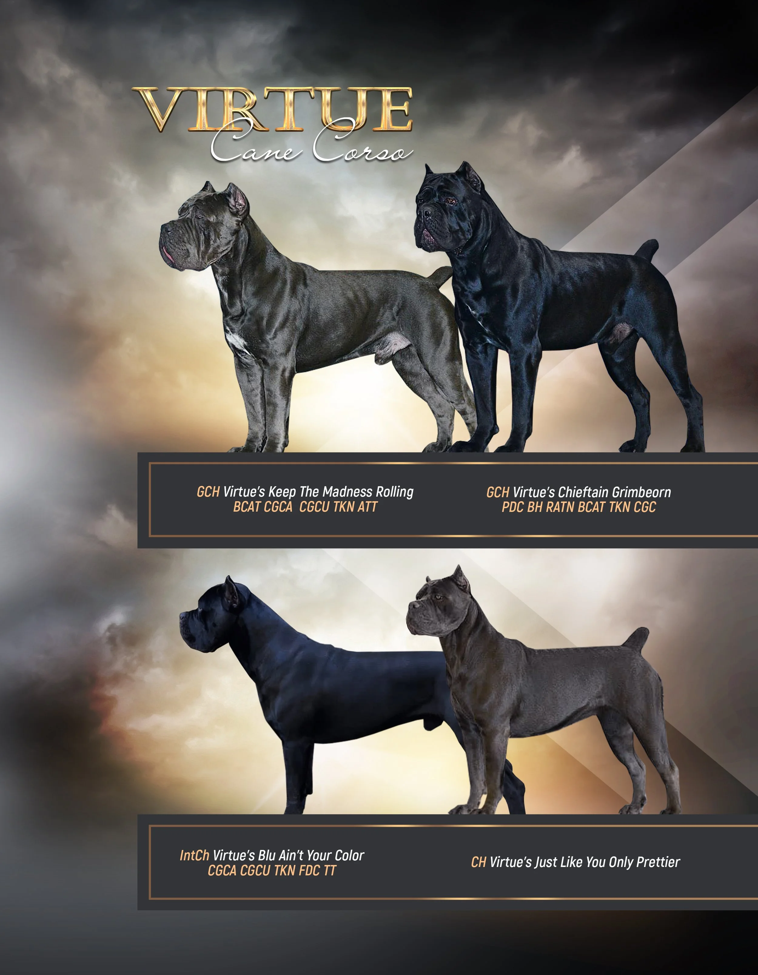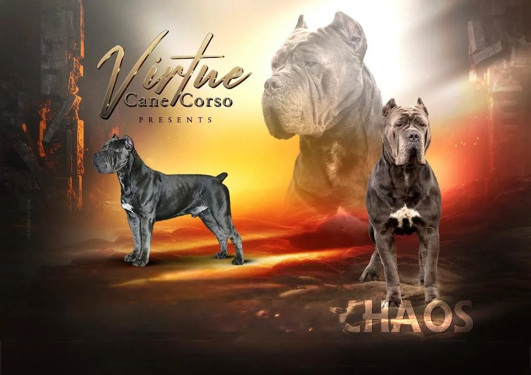 “Cinder” bred by OEM Cane Corso is the cornerstone of Virtue. Cinder is 26” and 125lbs. She is an absolutely stunning example of the Corso. She is everything you want in a female. She has great substance, bone, floating movement and is beautifully balanced with a head that demands you to look at her.